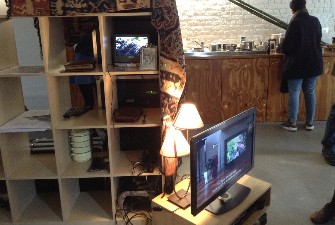 The pop-up installation will consist of a selection from all available materials (objects, furniture, documents, food, etc) and various screens (short loops, longer scenes, different lengths & sizes). Thusfar 75 min of moving image is available divided over about 15 screens.