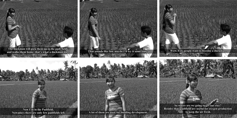 When David MacDougall introduced the concept of participatory cinema (1975) he was as always absorbed in the task of understanding and representing culture and anthropological knowledge. His idea was that inviting the subjects to be participants in the production of ethnographic films could help you achieve this understanding as a filmmaker and at the same time give the film more authenticity. This research method can convince filmmakers as well as audiences that the film brings them close to the reality of the people in the film. In the meantime anthropologists and other scholars have begun to use cameras as means to empower people/a community. This is perhaps a little misleadingly called participatory video yet it consists of direct camera training and sometimes editing training. Through this process people more or less take over the film themselves and it is hoped this enables them to voice their opinion and raise debates concerning their living conditions. The emphasis is on the process more than on the film product itself. The definition of which filming projects are genuinely participatory can be debated endlessly but more important are the implications and how we go about doing these aledgedly participatory projects. Some projects can be a mix of the forms and the project presented by Kevin Thompson and Sang Putu Kaler Surata began as the first but has developed into the last as it becomes clear their agenda is to make local Balinese aware of the cultural heritage of the Balinese landscape through the use of visual media like cameras and lately also websites. As scientists, respectively a landscape architect and an ecologist, they worry about the rapid uncontrolled growing of the cities at the expense of the rice fields that characterizes the beautiful Balinese cultivated landscape. This threatens not only the ecological balance but actually also the tourist industry, which is both part of the threat as well as threatened, as the very same rice fields are one of the greatest attractions.